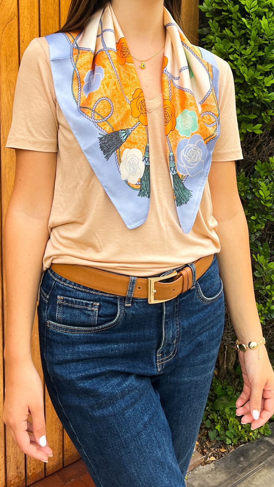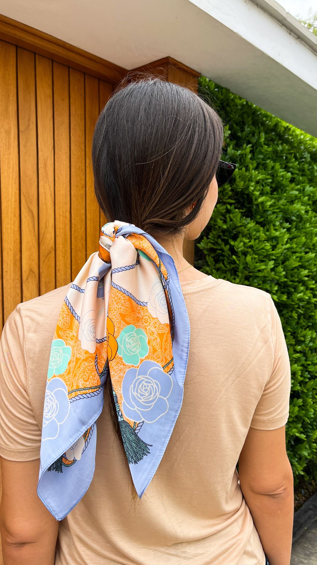 Bandana confeccionada en seda de alta calidad, suave al tacto y con una caída delicada. Sus medidas de 70 cm x 70 cm la hacen perfecta para usarla de múltiples formas: en el cuello, en el cabello, en la cadera, como accesorio para bolsos o como detalle en el outfit. Un complemento versátil y atemporal que aporta elegancia y estilo a cualquier look.