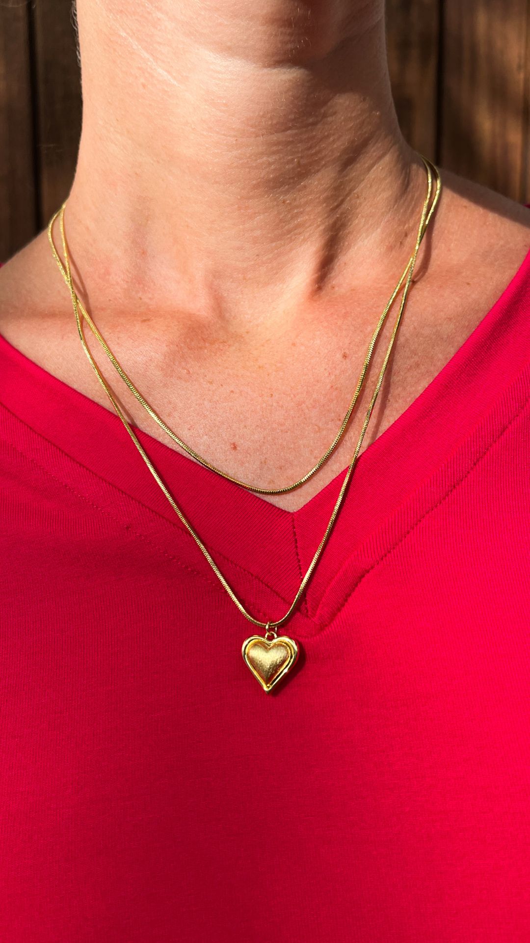 Collar doble de cobre bañado en oro, ideal para aportar un brillo elegante y delicado a cualquier look. Su diseño versátil lo hace perfecto para adaptarse a estilos casuales, elegantes o sport elegante. Una pieza atemporal que realza tu outfit con sutileza y sofisticación.