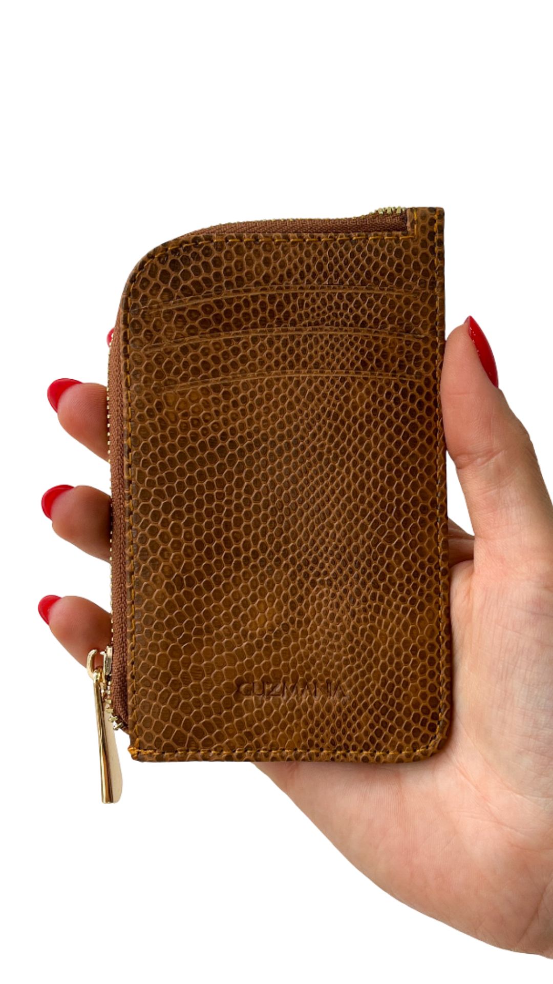 Tarjetero/monedero elaborado en cuero peruano con textura cocodrilo, que aporta un acabado brillante y sofisticado. Su color marrón le da un toque moderno y elegante, ideal para quienes buscan un accesorio funcional con personalidad. Con un tamaño de 12 cm de alto por 8 cm de ancho, permite organizar tarjetas y dinero de forma práctica, siendo perfecto para el uso diario o como complemento dentro del bolso.