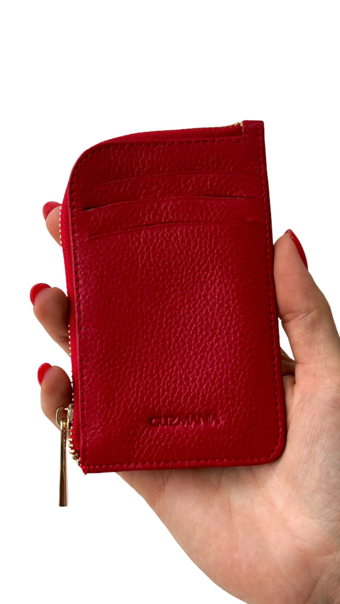 Tarjetero/monedero elaborado en cuero peruano con textura rugosa, que aporta un acabado brillante y sofisticado. Su color rojo intenso le da un toque moderno y elegante, ideal para quienes buscan un accesorio funcional con personalidad. Con un tamaño de 12 cm de alto por 8 cm de ancho, permite organizar tarjetas y dinero de forma práctica, siendo perfecto para el uso diario o como complemento dentro del bolso.